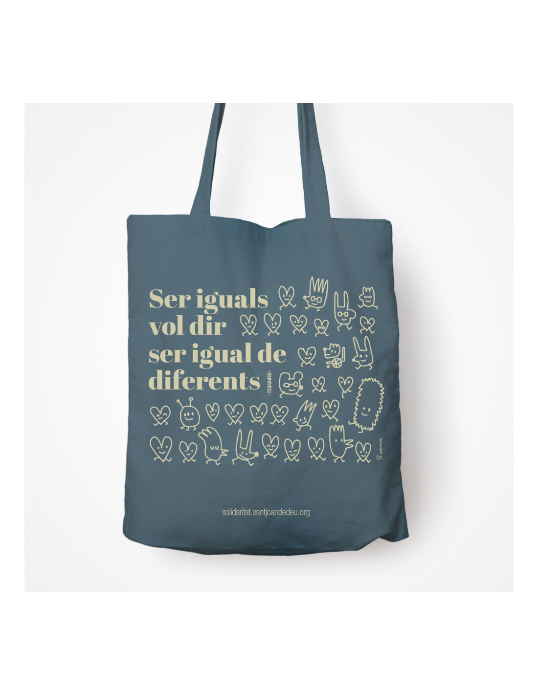 Bossa 100% cotó impresa a una cara amb il·lustracions de Javier Royo i el missatge "Ser iguals vol dir ser igual de diferents" de la cançó El tren del temps de Txarango. La diversitat és riquesa, i el respecte pel que és diferent ens fa iguals.