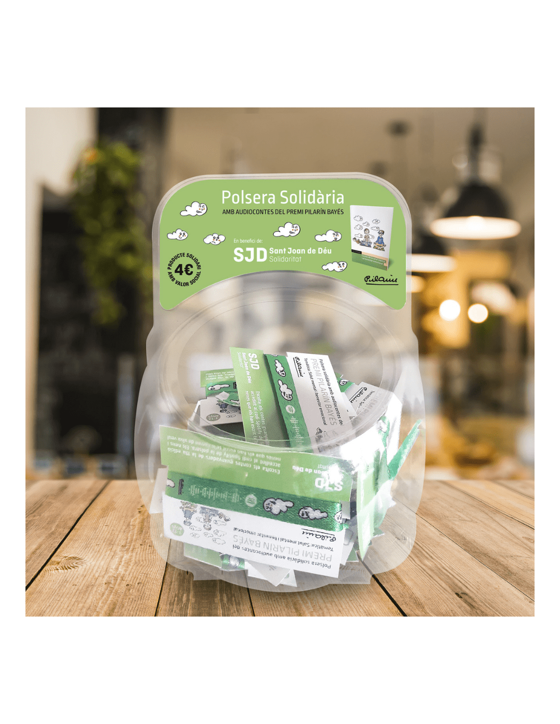 Fes el teu esdeveniment més solidari col·locant aquest expositor de 30 polseres amb audiocontes. Aquests contes tracten temes de la salut mental i estan narrats pels mateixos nens que els van escriure per a la 19a edició dels Premis Pilarín Bayés.