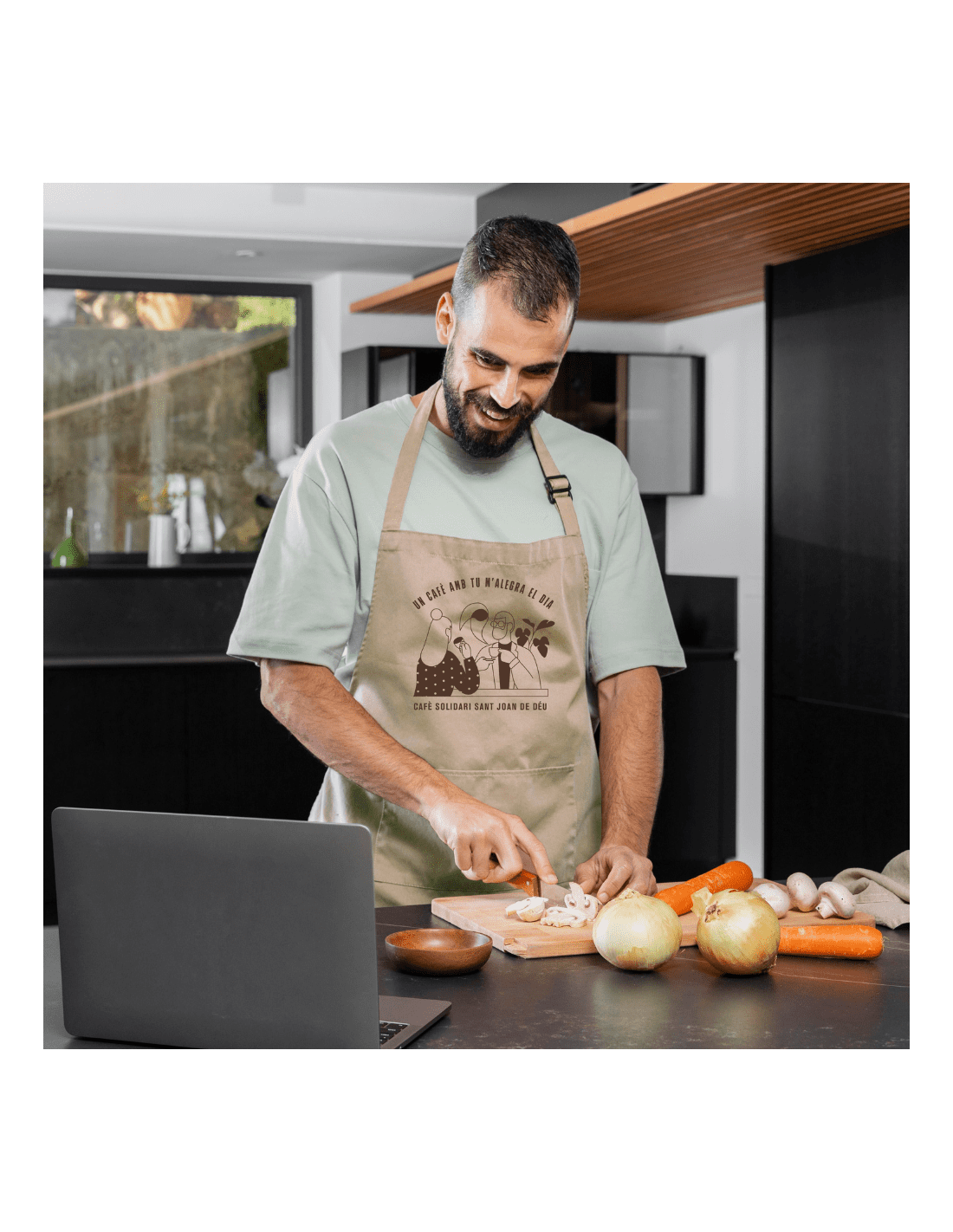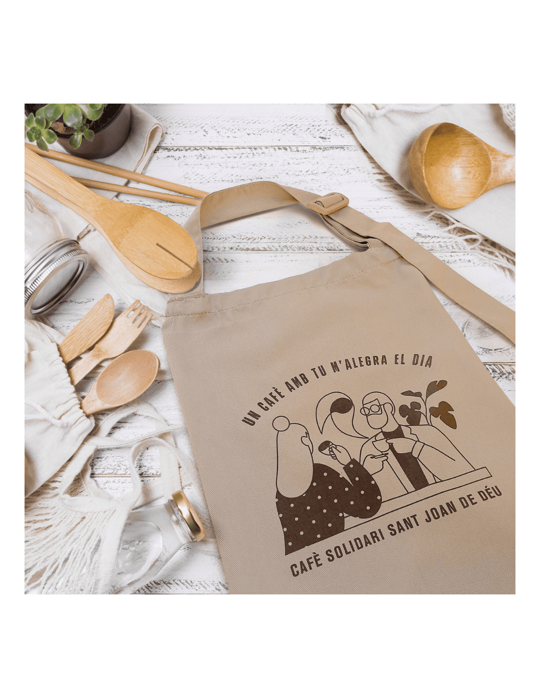 Aquest davantal conté el lema “Un cafè amb tu m'alegra el dia” i forma part de la Campanya Cafè Solidari.