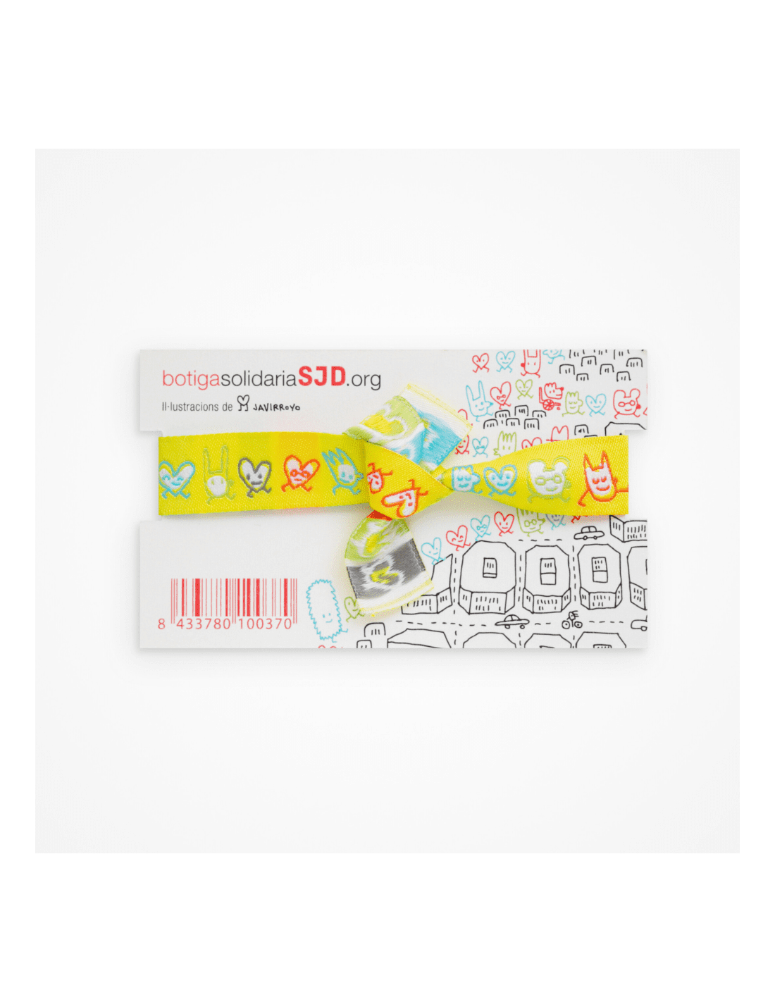 Polsera amb il·lustracions de Javier Royo que defineixen la diversitat d'una manera divertida. La polsera fa 30 cm per a que puguis lligar-te al canell una infinitat de cors solidaris.