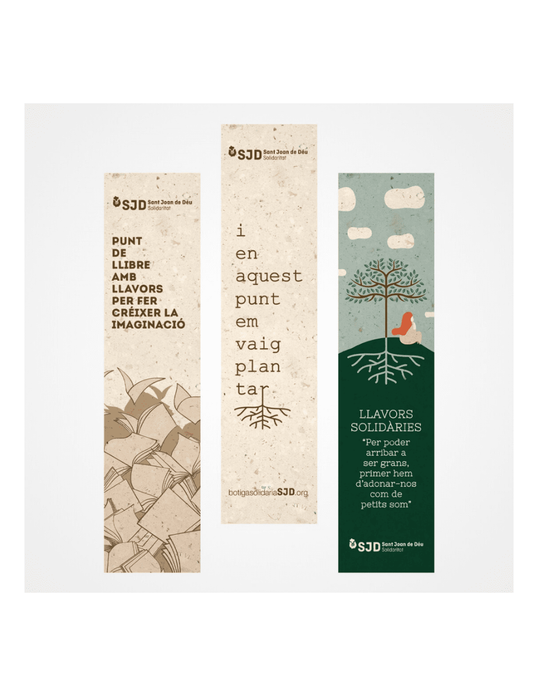 Tres punts de llibre amb llavors per fer créixer la solidaritat.