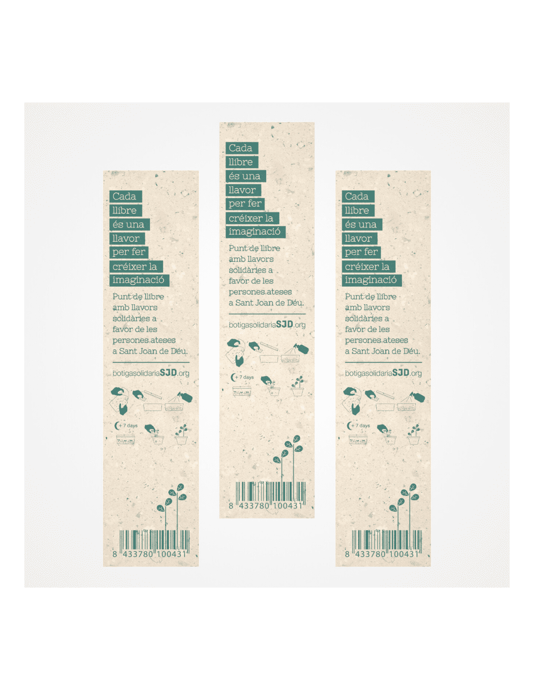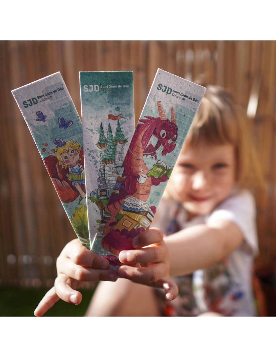 Punts de llibre plantables i dissenyats per la il·lustradora Verónica Pérez en exclusiva per a Sant Joan de Déu. Aquests punts et permetran donar-li un final feliç a cada història: una vegada acabat el llibre, planta el punt que has utilitzat i fes créixer la solidaritat.