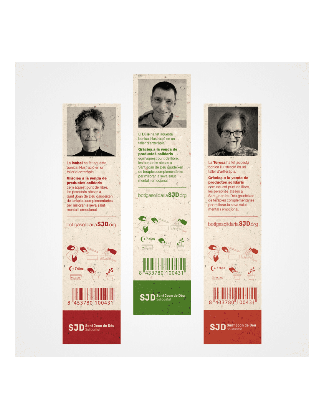 Punts de llibre plantables i dissenyats per usuaris i usuàries de Sant Joan de Déu en tallers d'artteràpia. Aquests punts et permetran donar-li un final feliç a cada història: una vegada acabat el llibre, planta el punt que has utilitzat i fes créixer la solidaritat.