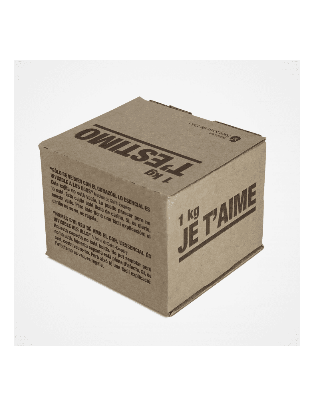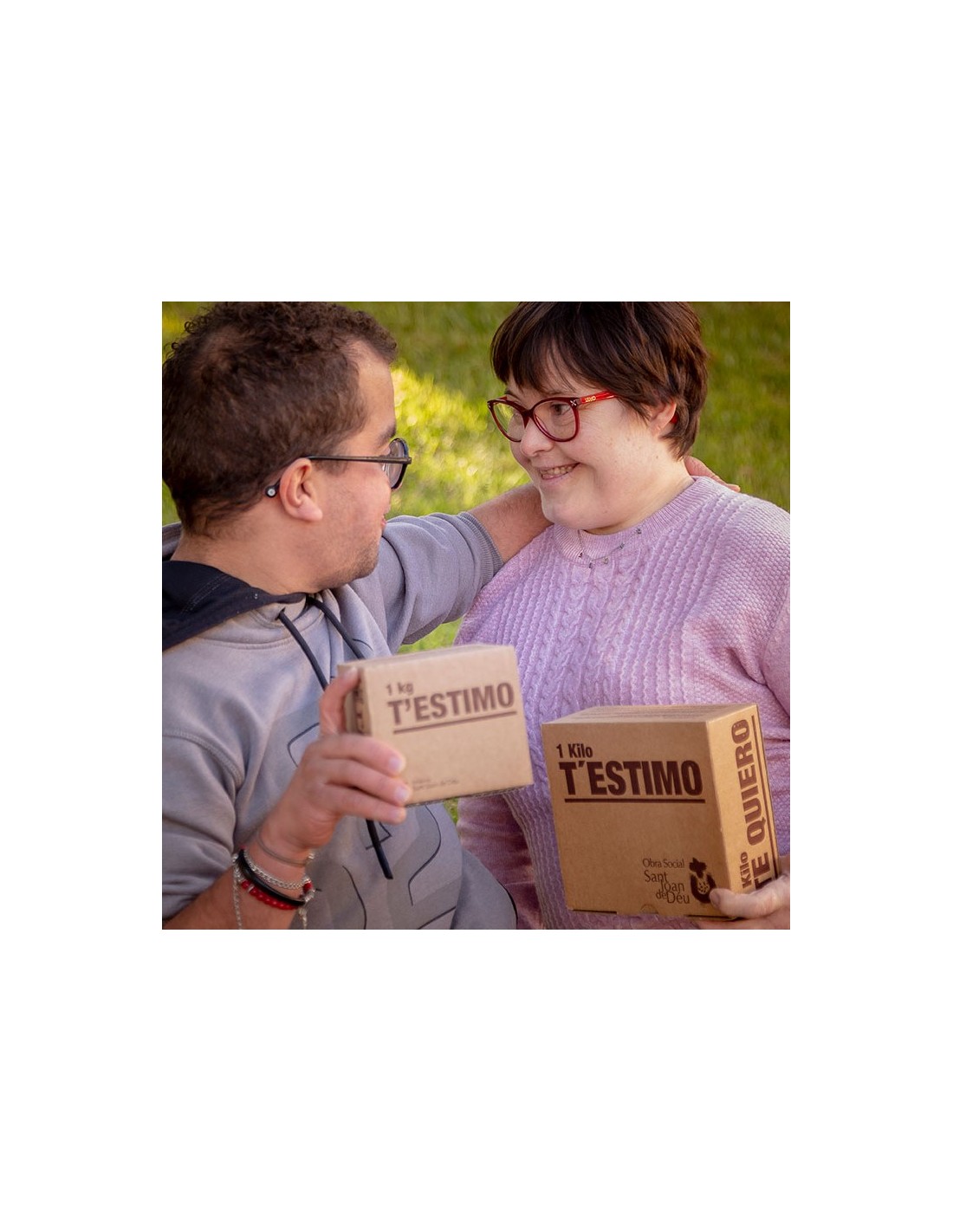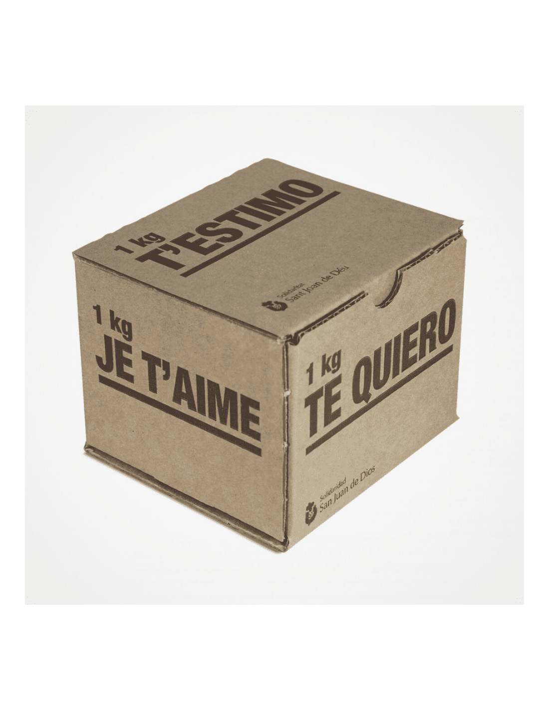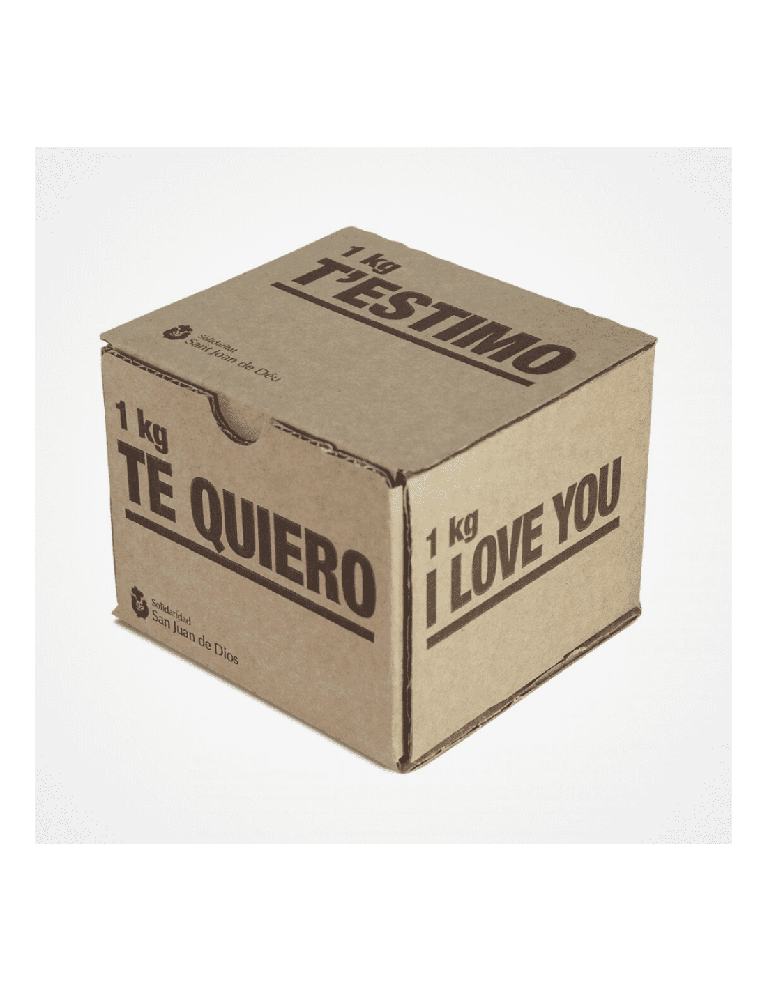 La capsa solidària de cartró "1 Kg T'estimo" està pensada per a aquelles persones que volen expressar el seu afecte cap als altres i, a la vegada, ajudar a fer realitat els projectes solidaris de Sant Joan de Déu.