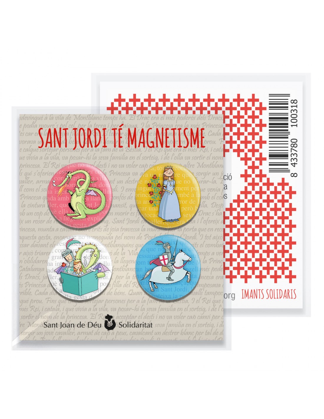 Conjunt de quatre imants rodons de 32 mm de diàmetre. Il·lustracions de Cristina Losantos amb motius de Sant Jordi. Acabat mat.