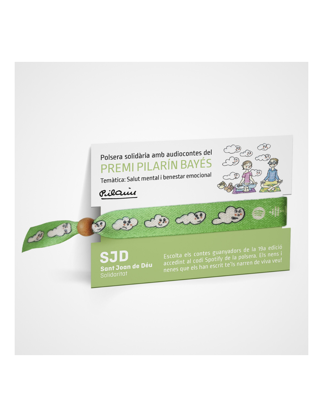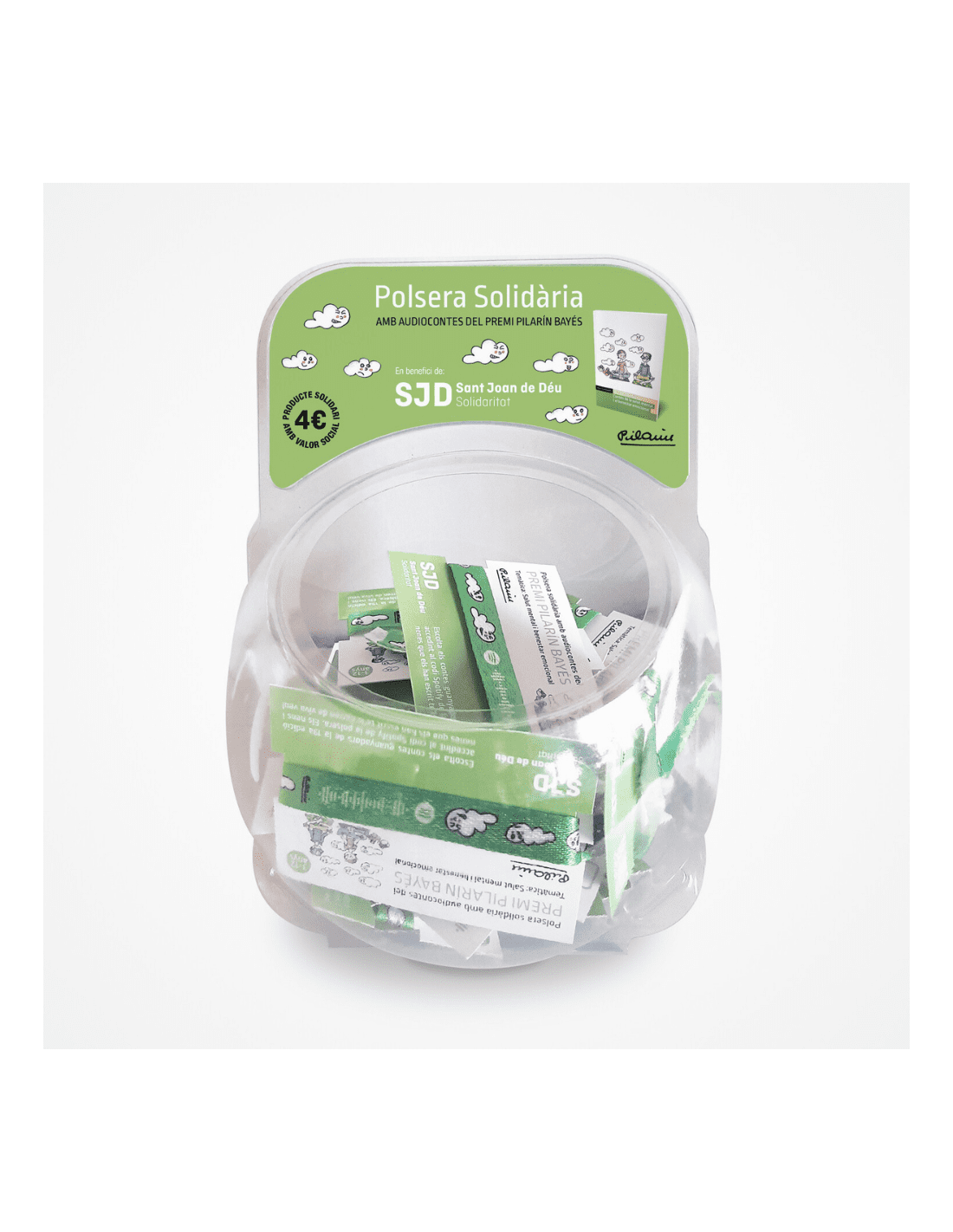 Haz tu evento más solidario colocando este expositor de 30 pulseras con audiocuentos. Estos cuentos tratan temas de la salud mental y están narrados por los mismos niños que los escribieron para la 19ª edición de los Premios Pilarín Bayés.