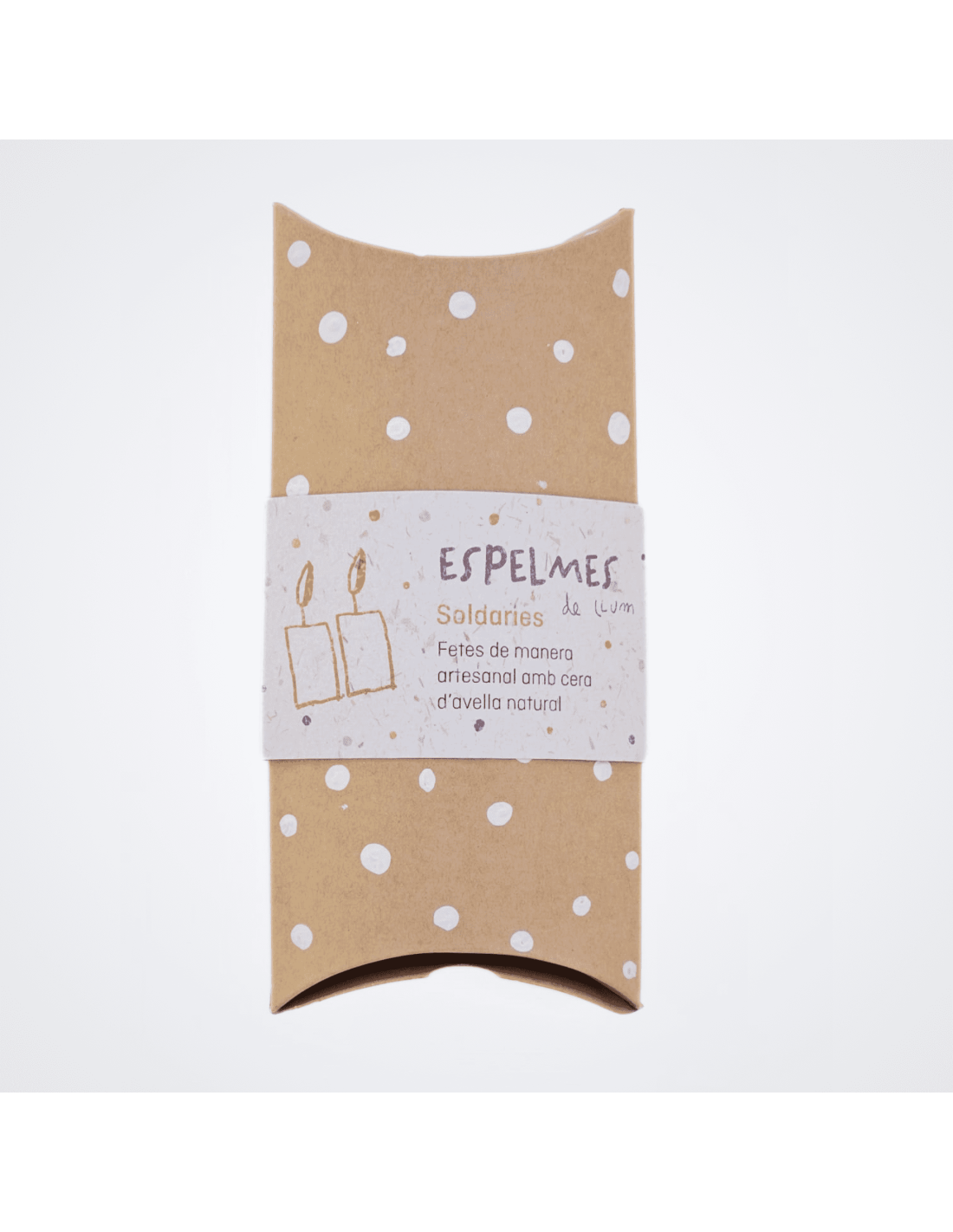 Pack de dos velas solidarias realizadas con cera de abeja natural, con un packaging sin plásticos y cartón reciclado.